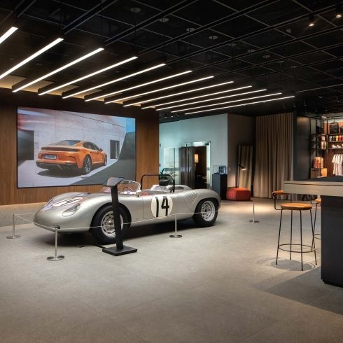 Porsche Studio Naples is a boutique showroom that redefines the automotive experience on Naples’ 5th Avenue South. The space features a premium coffee and beverage bar, refined private meeting lounges, and concierge-style hospitality. At its center, a classic Porsche is showcased under custom lighting, creating a striking focal point. It represents Florida’s first Porsche Studio and one of only five across the U.S.